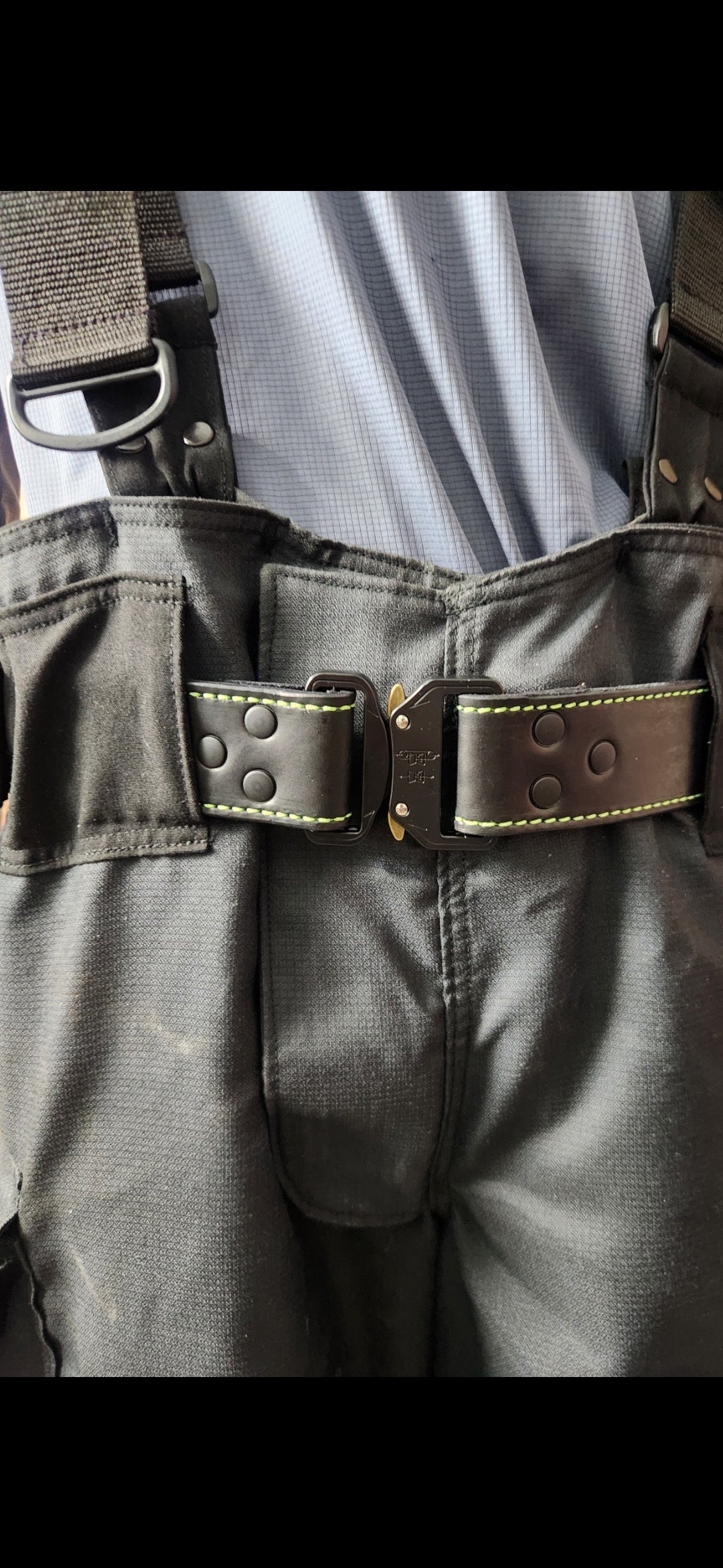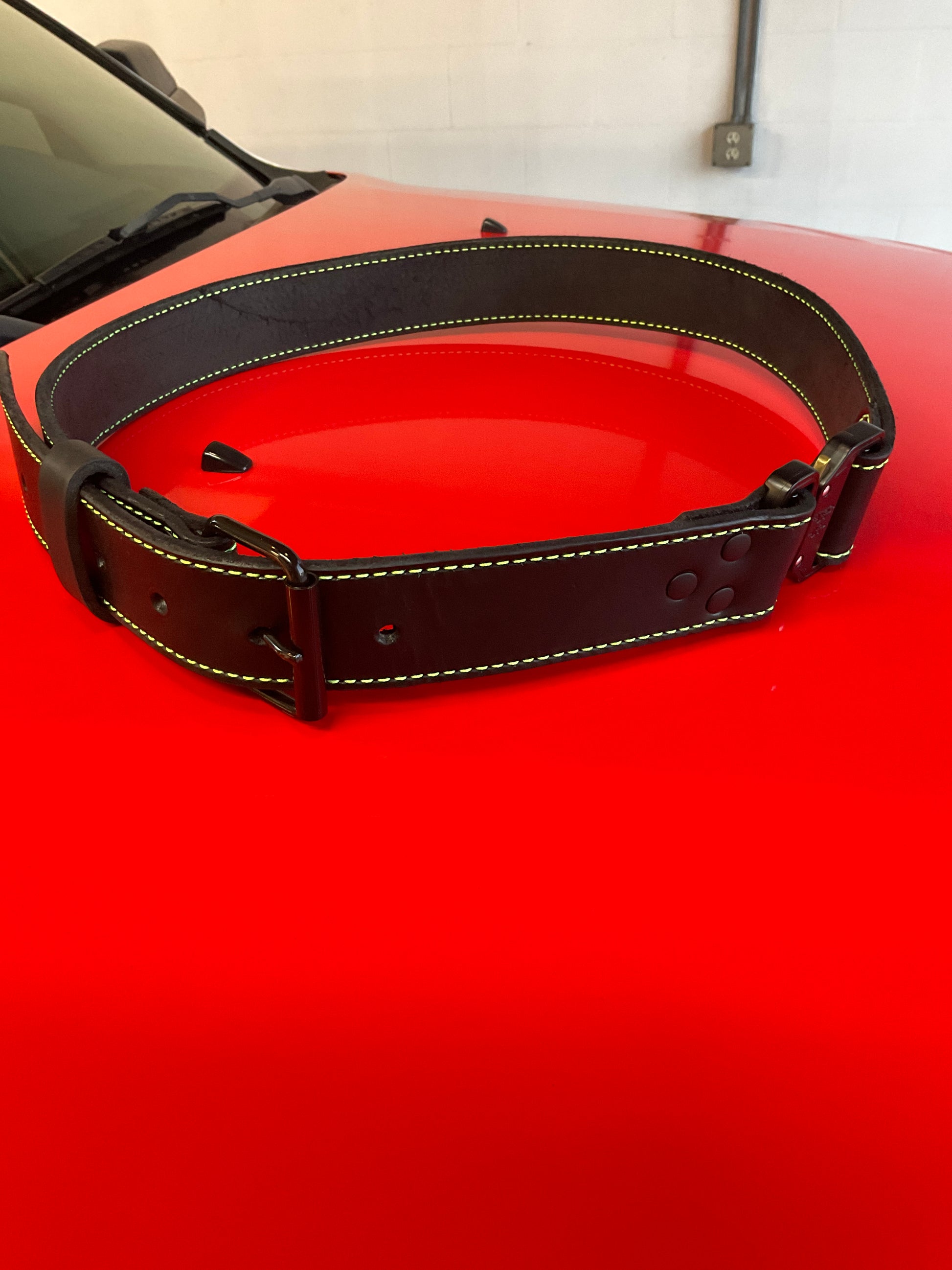 Bridle leather Truckie Belt for bunker gear. 10 to 13oz leather. Available in different leather colors , with or without stitching(multiple colors available. Choice of hardware color: black, brass, or nickel.